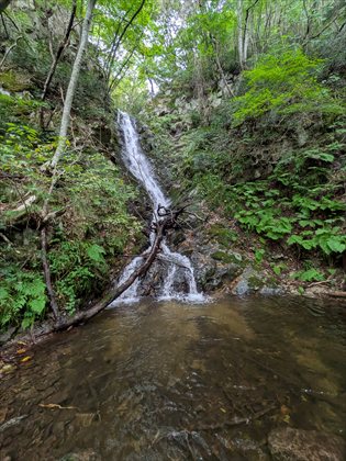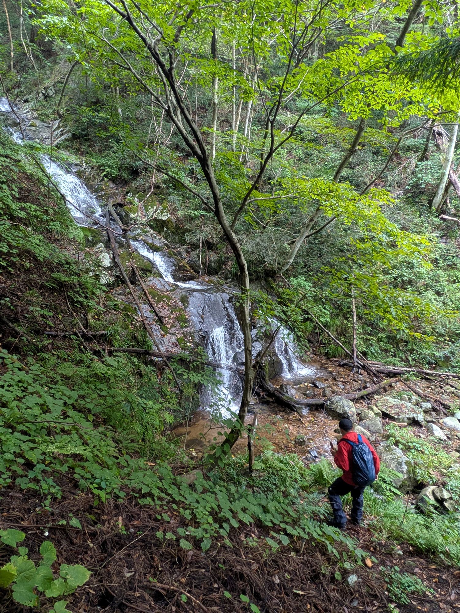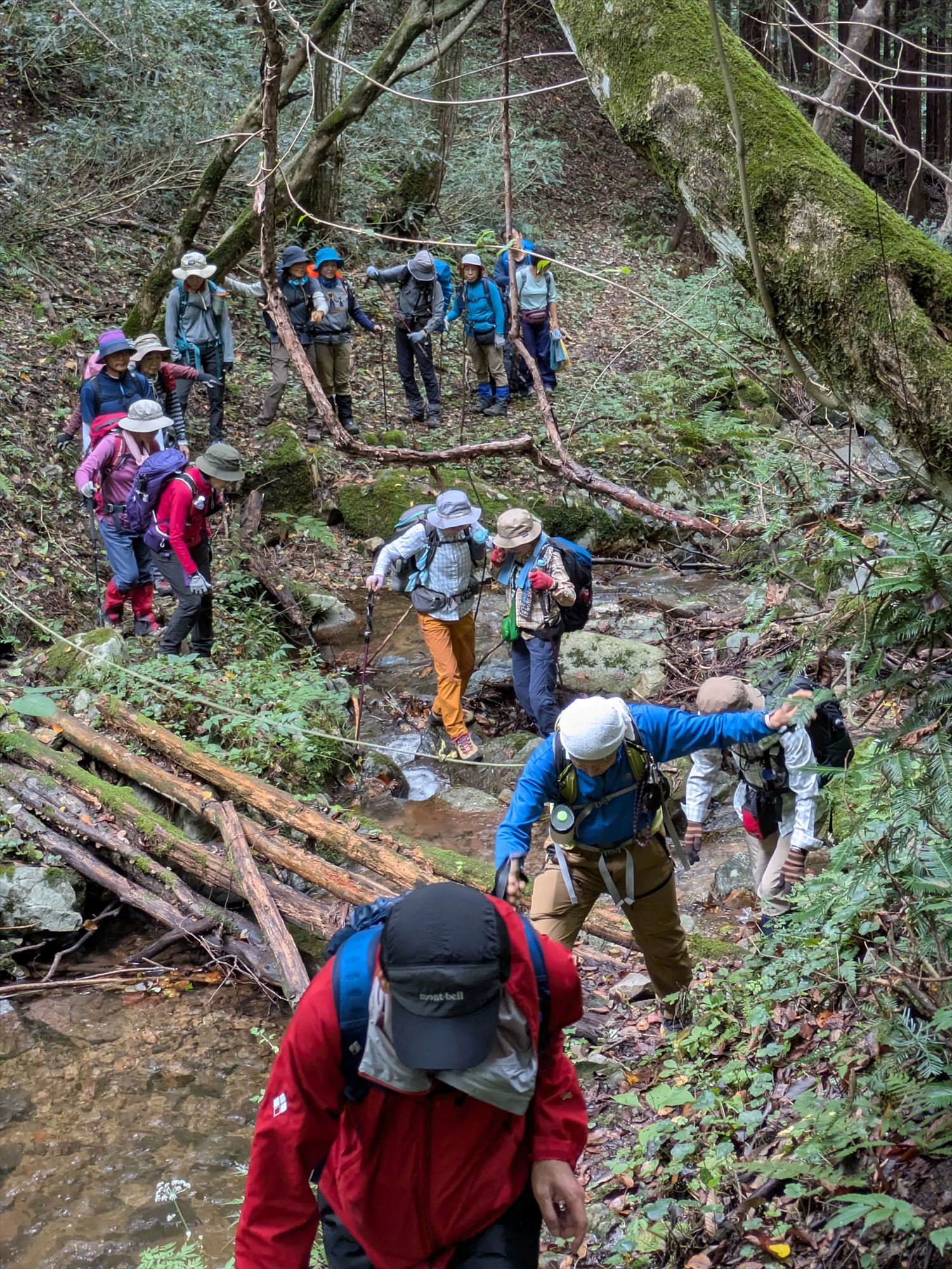 川を渡る箇所では、丸太がたわんだり動いたりして、滑らないかドキドキしながら慎重に渡りました。 滝へ向かう細い道は、前日の雨の影響で足元が少しぬかるんでおり、滑らないよう注意しながら進みました。